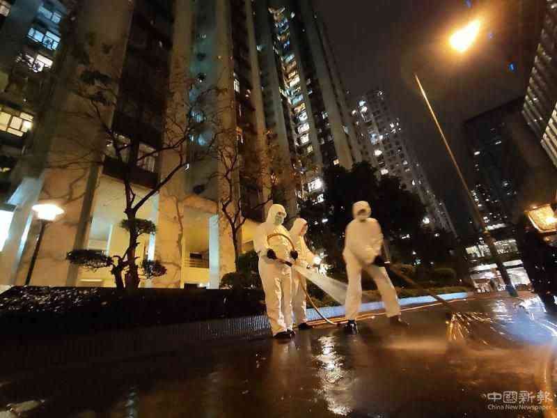 圖:穿上全套保護(hù)裝備的清潔人員在太古城明宮閣附近清洗街道\大公報(bào)記者攝