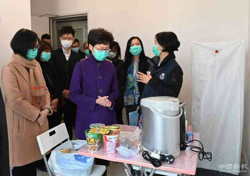 圖:行政長官林鄭月娥(前排左二)昨日到火炭駿洋邨,視察檢疫中心為隔離者提供的物資