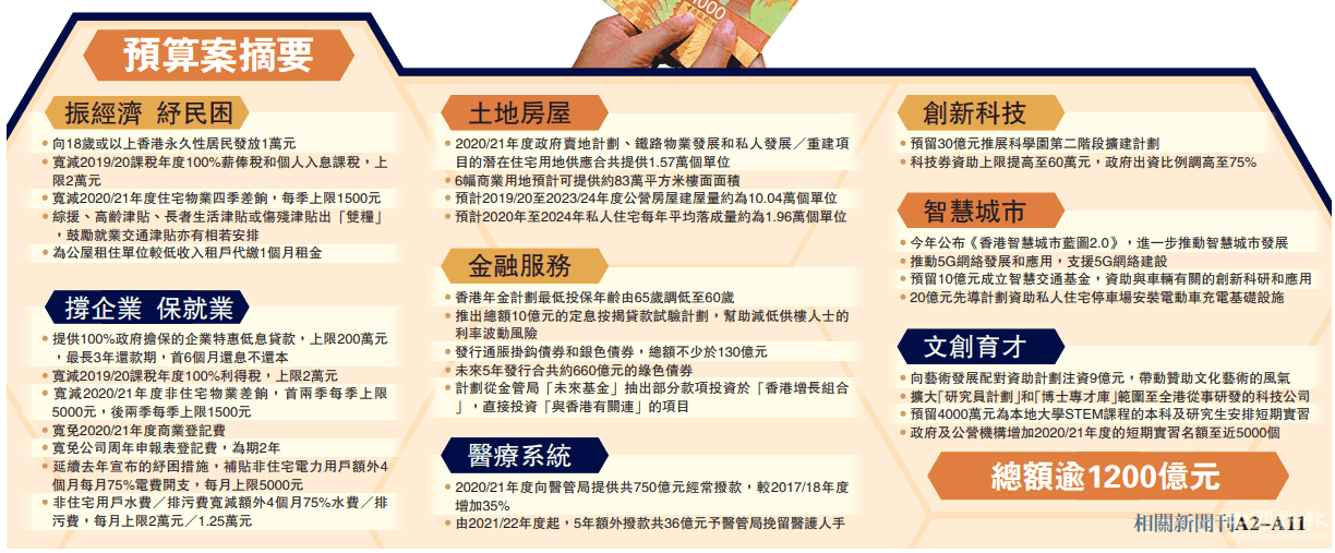 陳茂波昨日上午在立法會(huì)宣讀新一份財(cái)政預(yù)算案。他表示,過(guò)去一年發(fā)生的社會(huì)事件損了經(jīng)濟(jì)、傷了民心,接著又遇上新型冠狀病毒疫情,故縱使下年度財(cái)政預(yù)算會(huì)出現(xiàn)歷來(lái)最高的赤字,仍決定推出涉及超過(guò)1200億元的大規(guī)模逆周期措施,為市民和企業(yè)克服難關(guān)提供幫助。