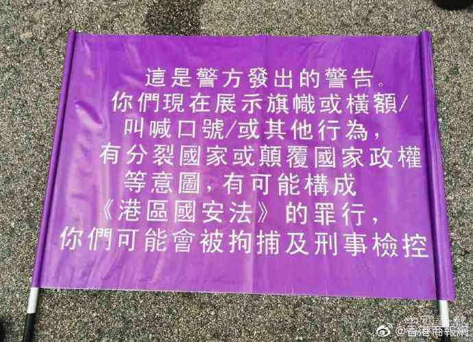 根據(jù)港媒曝光的圖片,紫色的旗幟上分別用中文和英文寫(xiě)道:這是警方發(fā)出的警告,你們現(xiàn)在展示旗幟或橫幅,叫喊口號(hào)或其他行為,有分裂國(guó)家或顛覆國(guó)家政權(quán)等意圖,有可能構(gòu)成香港國(guó)安法的罪行,你們可能會(huì)被拘捕及刑事檢控。