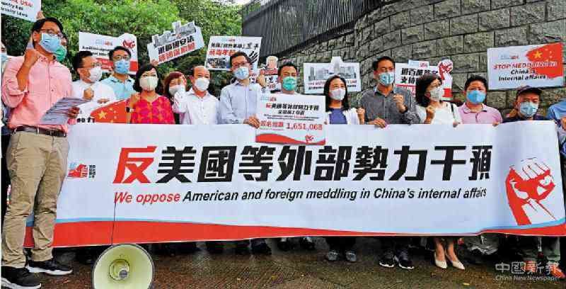自全國(guó)人大展開香港國(guó)安法立法程序以來,以美國(guó)為首的外部勢(shì)力不斷粗暴干預(yù)香港事務(wù)。“香港各界撐國(guó)安法聯(lián)合陣線”(聯(lián)合陣線)昨日前往美國(guó)駐港總領(lǐng)事館抗議,表示已收集到逾165萬個(gè)“反美國(guó)等外部勢(shì)力干預(yù)”的電子簽名,抗議美國(guó)干預(yù)中國(guó)內(nèi)政及香港事務(wù),奉勸美國(guó)“回頭是岸”。總領(lǐng)事館拒絕派員接收請(qǐng)?jiān)感?,在?chǎng)人士對(duì)此表示極度憤怒,將簽名及請(qǐng)?jiān)感欧旁陬I(lǐng)事館門口后離去。