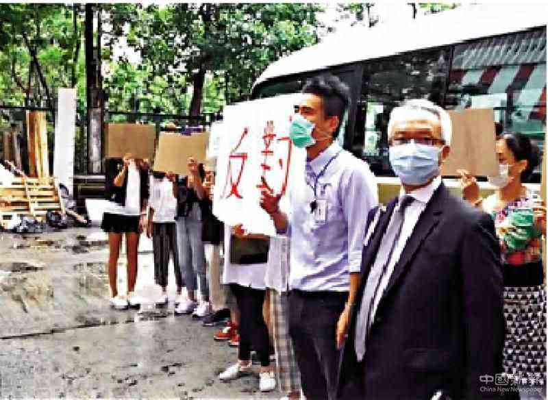 圖:先遣隊(duì)到達(dá)太平工業(yè)園時(shí),約十人到場(chǎng)舉牌抗議