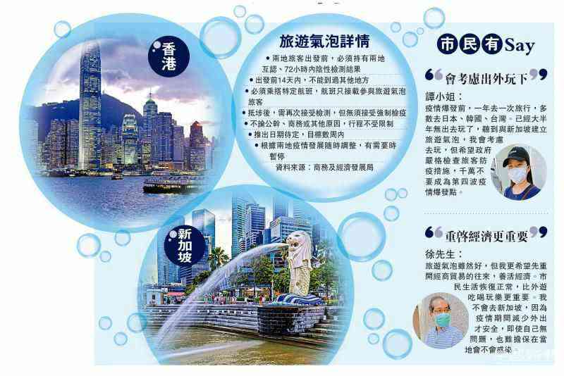 商務(wù)及經(jīng)濟發(fā)展局局長邱騰華昨日宣布,本港與新加坡已就建立雙邊“航空旅遊氣泡”安排,達成原則性協(xié)議,兩地旅客攜自費的兩地互認檢測陰性結(jié)果,乘搭特定航班,抵埗后即可豁免14日強制檢疫,而且來往目的及行程均不受限制。政府希望,數(shù)星期內(nèi)落實“旅游氣泡”,并公布生效日期,兩地將視乎疫情隨時調(diào)整。旅游航空業(yè)界普遍歡迎“旅游氣泡”,但認為最重要是早日恢復(fù)香港和內(nèi)地交通。