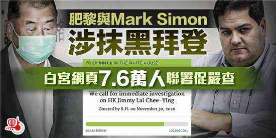 涉嫌違反香港國(guó)安法、官司纏身的亂港黑手、壹傳媒創(chuàng)辦人黎智英潛逃風(fēng)險(xiǎn)極高,本月23日竟獲高等法院原訟庭法官李運(yùn)騰批準(zhǔn)保釋?zhuān)鹗忻駱O大憤怒。黎智英另于10月底卷入涉嫌造假抹黑當(dāng)時(shí)為美國(guó)總統(tǒng)候選人拜登的丑聞,黎其后承認(rèn)助手Mark Simon有份參與,所用金錢(qián)由黎公司提供。早前有網(wǎng)民在美國(guó)白宮網(wǎng)站發(fā)起聯(lián)署,截至今日(25日)已有超過(guò)7.6萬(wàn)人參與,要求美國(guó)政府調(diào)查兩人是否涉及發(fā)布虛假訊息以及非法干預(yù)大選。