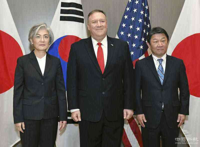 圖:(從左至右)韓國外長康京和、美國國務(wù)卿蓬佩奧和日本外務(wù)大臣茂木敏充14日在美國三藩市會(huì)晤\網(wǎng)絡(luò)圖片