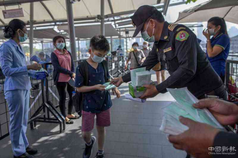 圖:衛(wèi)生官員在曼谷的商場前分發(fā)口罩/美聯社