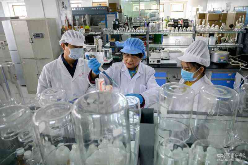 圖:29日,在太原市,留美回國創(chuàng)業(yè)的渠志燦博士(中)帶領員工加班生產(chǎn)免洗抑菌噴霧捐贈抗疫前線/中新社