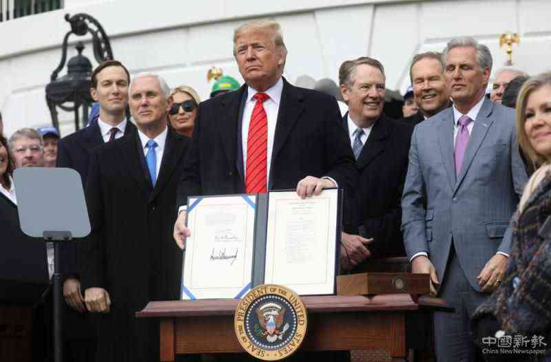 圖:美國總統(tǒng)特朗普(中)29日在白宮展示新簽署的美墨加協(xié)定\路透社