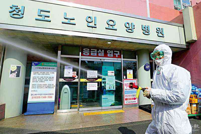 資料圖:韓國大邱檢疫人員在醫(yī)院前消毒\美聯(lián)社