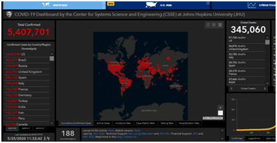 另據(jù)美國約翰斯﹒霍普金斯大學(xué)數(shù)據(jù)數(shù)據(jù)統(tǒng)計,截止北京時間5月25日11時32分,全球累計新冠肺炎確診病例超540萬例,達5407701例;累計死亡病例345060例。