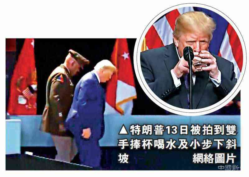 圖:特朗普13日被拍到雙手捧杯喝水及小步下斜坡\網(wǎng)絡(luò)圖片