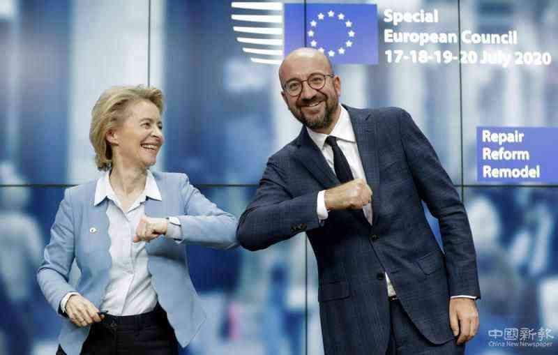 圖:歐盟委員會主席馮德萊恩(左)和歐洲理事會主席米歇爾21日慶祝達成協(xié)議\美聯(lián)社