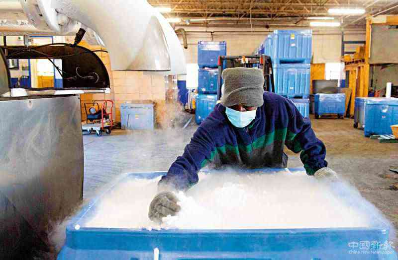 圖:美國藥廠輝瑞正發(fā)動(dòng)全美干冰生產(chǎn)商,為疫苗供應(yīng)干冰\法新社
