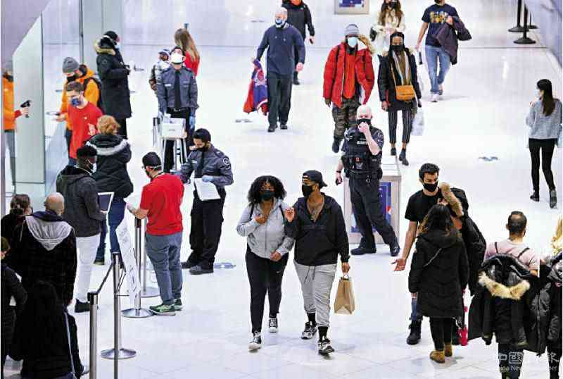 圖:加拿大安大略26日出現(xiàn)兩宗變種病毒感染病例,隨即宣布封城。圖為24日當(dāng)?shù)鼐用裢獬鲑?gòu)物/美聯(lián)社