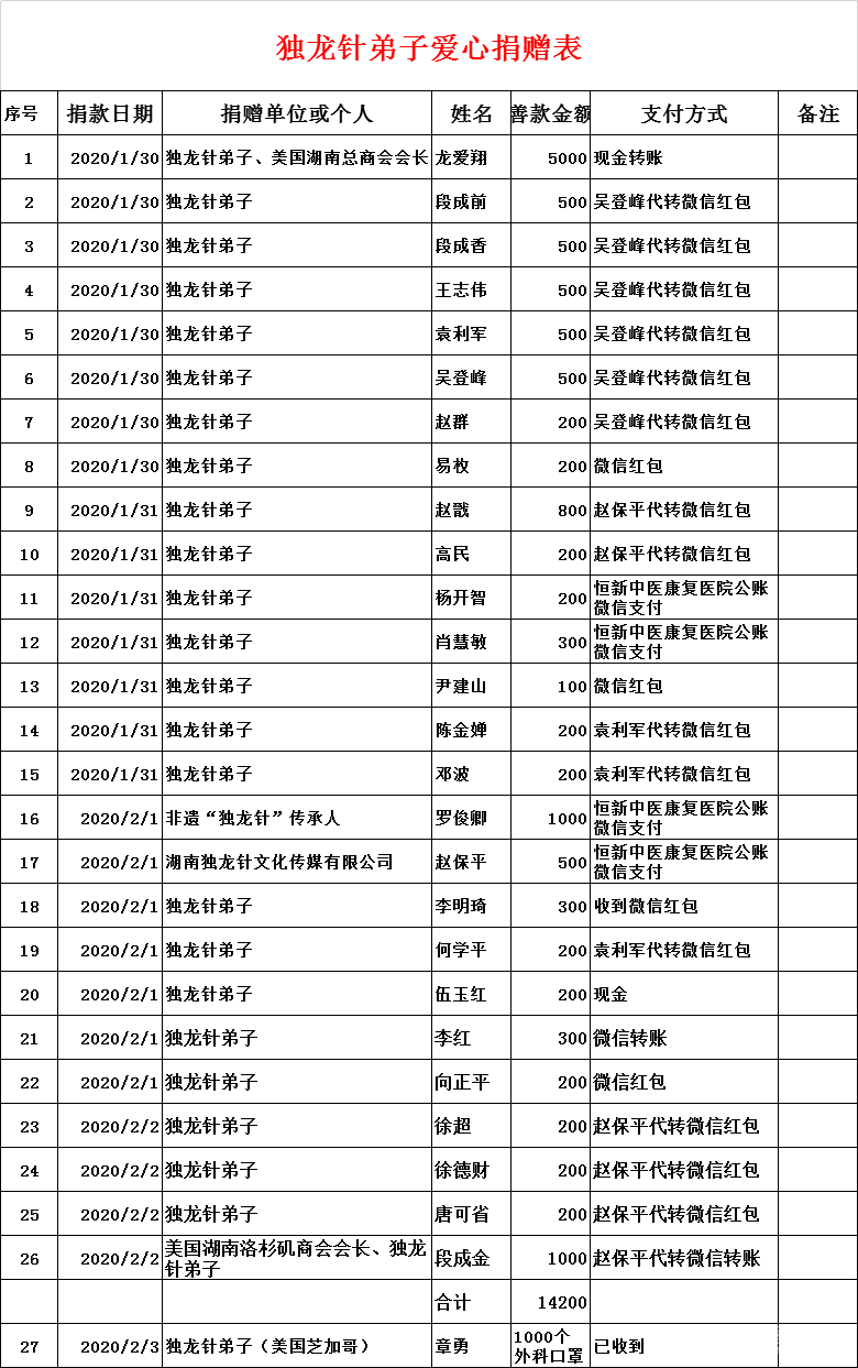 非物質(zhì)文化遺產(chǎn)獨(dú)龍針法,起源于雪峰山下的洞口縣,受他的感召,遠(yuǎn)在美國(guó)、廣東、貴陽、懷化以及洞口的龍門弟子和社會(huì)各界愛心人士紛紛行動(dòng)起,大家決定為洞口縣在一線奮戰(zhàn)的工作人員貢獻(xiàn)出自己的一份力量,增加他們的健康安全保障。