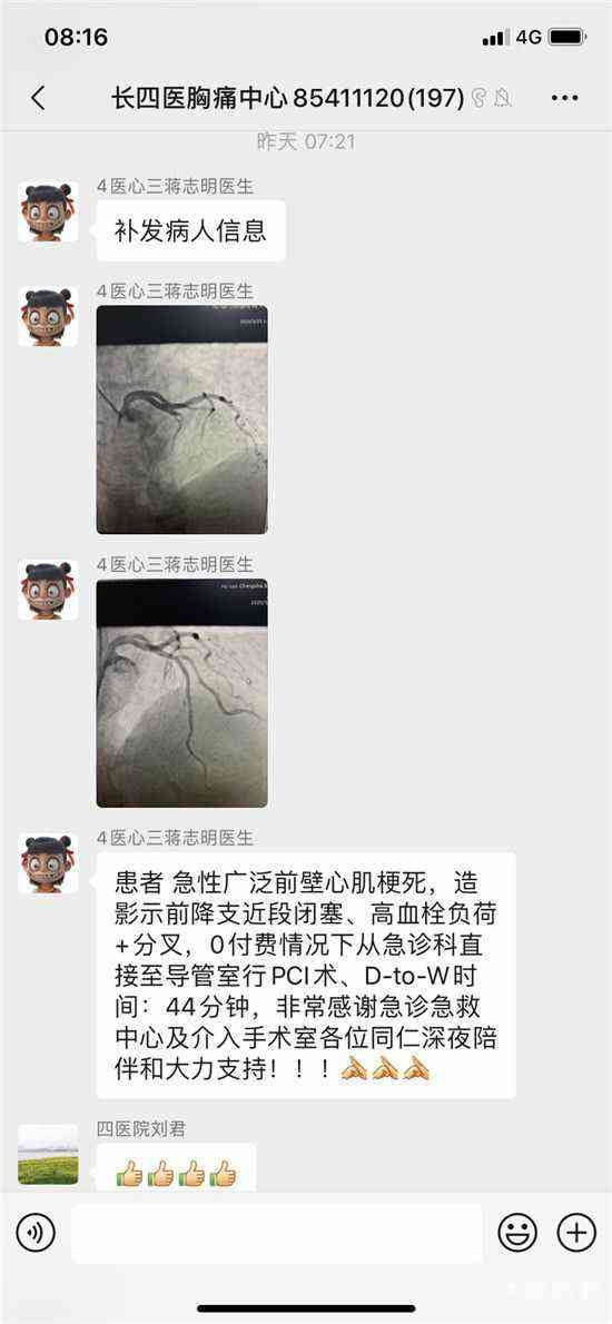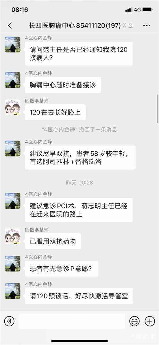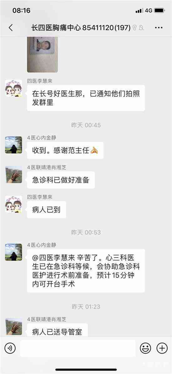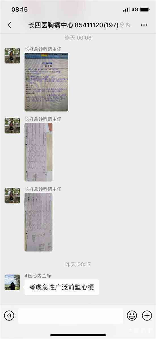 當日凌晨0:06,心血管三科副主任金靜在“長四醫(yī)胸痛中心8511120”微信群中收到一張心電圖。原來是黨建醫(yī)聯(lián)體長好醫(yī)院急診科收治了一位58歲突發(fā)胸痛的男性患者,急診科主任范志英通過心電圖檢查考慮其為急性廣泛前壁心梗,情況十分危險!范志英立即上傳了患者信息至胸痛中心微信群,并撥打了四醫(yī)院急診急救電話。