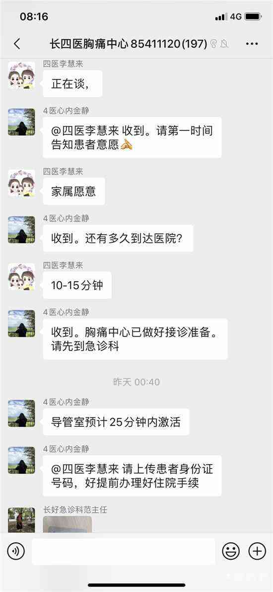 時間就是生命!00:24,市四醫(yī)院救護車接到患者,心血管三科副主任醫(yī)師金靜立即與救護車隨行的院前急救醫(yī)師李慧來聯(lián)系,通過微信進行遠程指導,即讓患者平躺,心電監(jiān)護,建好靜脈通道……李慧來在金靜副主任醫(yī)師的指導下進行搶救,隨時準備啟用心臟除顫器,確保靜脈通路通暢,并與患者家屬進行術前談話。同時,胸痛中心值班副主任醫(yī)師蔣志明立即通知醫(yī)院相關部門迅速開通醫(yī)療綠色通道,隨時準備為患者手術。