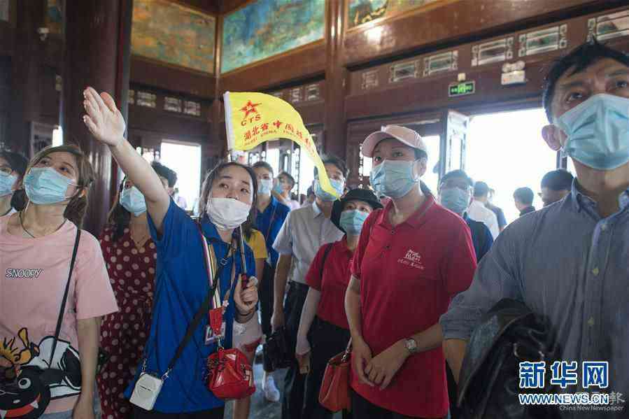 8月7日,導(dǎo)游在黃鶴樓景區(qū)為受邀來(lái)湖北旅游的援鄂醫(yī)療隊(duì)員講解。