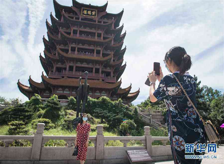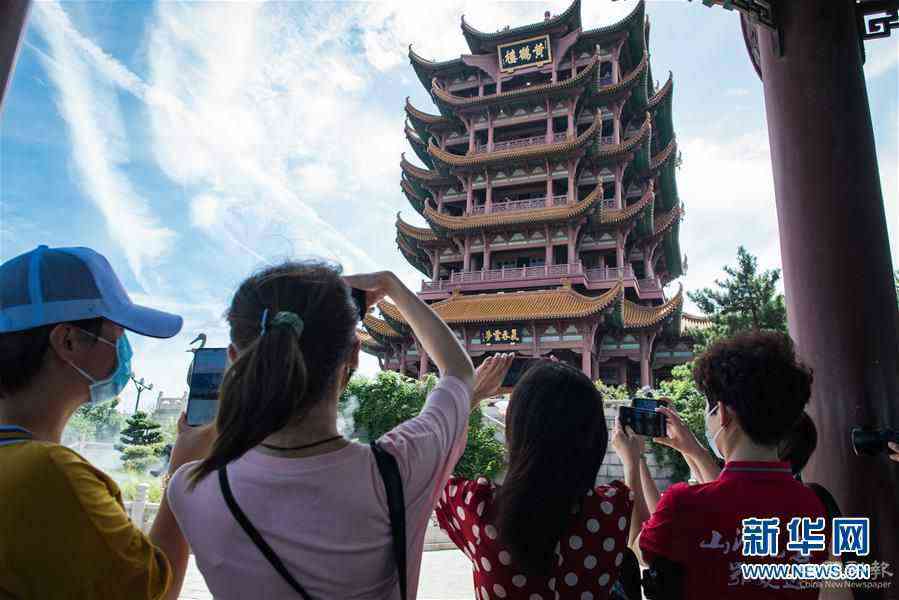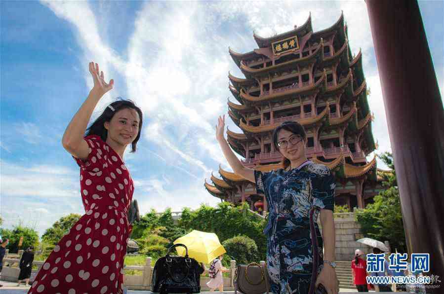 8月7日,受邀來(lái)湖北旅游的援鄂醫(yī)療隊(duì)員在黃鶴樓景區(qū)拍照。新華社記者 肖藝九 攝