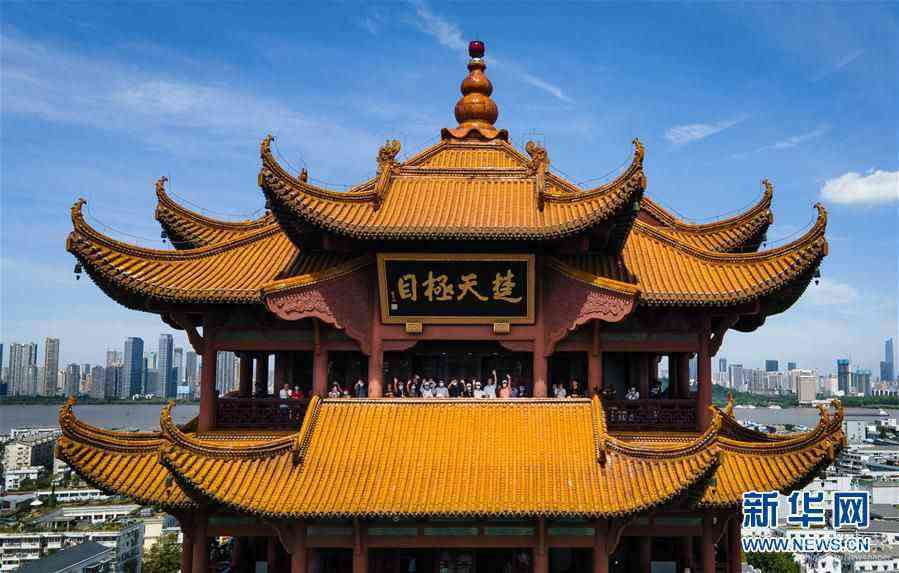 8月7日,受邀來(lái)湖北旅游的援鄂醫(yī)療隊(duì)員在黃鶴樓景區(qū)游覽(無(wú)人機(jī)照片)。新華社記者 肖藝九 攝