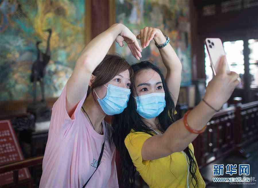 8月7日,受邀來(lái)湖北旅游的青海援鄂醫(yī)療隊(duì)員雷占玲(右)在黃鶴樓景區(qū)自拍。新華社記者 肖藝九 攝