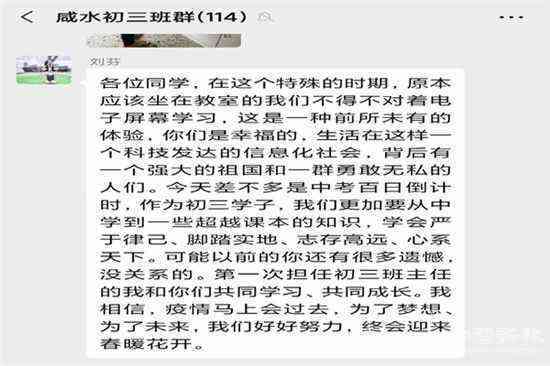 專題課結(jié)束之后,劉芬老師在班級群給孩子們寫了一段話:“在這個(gè)特殊的時(shí)期,原本應(yīng)該坐在教室的我們不得不對著電子屏幕學(xué)習(xí),這是一種前所未有的體驗(yàn),你們是幸福的,生活在這樣一個(gè)科技發(fā)達(dá)的信息化社會(huì),背后有一個(gè)強(qiáng)大的祖國和一群勇敢無私的人們。今天差不多是中考百日倒計(jì)時(shí),作為初三學(xué)子,我們更加要從中學(xué)到一些超越課本的知識,要嚴(yán)于律己、腳踏實(shí)地、志存高遠(yuǎn)、心系天下??赡芤郧暗哪氵€有很多遺憾,沒關(guān)系的。第一次擔(dān)任初三班主任的我和你們共同學(xué)習(xí)、共同成長。我相信,疫情馬上會(huì)過去。為了夢想、為了未來,我們好好努力,終會(huì)迎來春暖花開。”