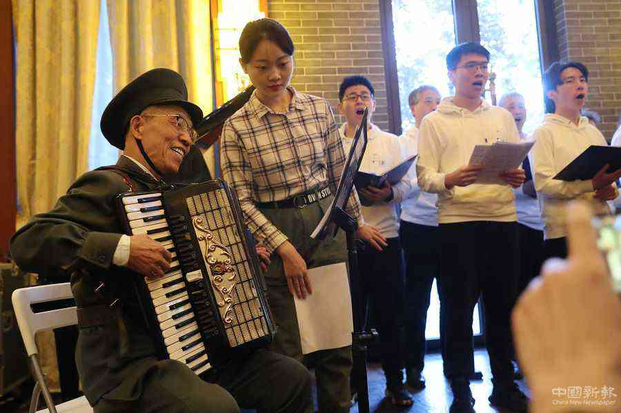 曾以鐵道文藝兵身份前往朝鮮前線的呂良與中國傳媒大學(xué)新聞學(xué)院白楊合唱團(tuán)、教授合唱團(tuán)在現(xiàn)場演出了由呂良在朝鮮戰(zhàn)場創(chuàng)作的曲目《搶修新線聯(lián)唱(節(jié)選)》。中國日報(bào)記者 王敬 攝