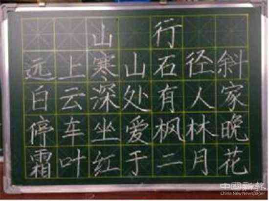 每人一塊小黑板,一根白粉筆,一首由教師代表抽取了一篇唐代杜牧的七言古詩(shī)《山行》,集體限時(shí)創(chuàng)作完成。