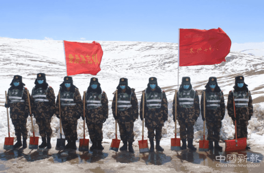 武警官兵多機(jī)械協(xié)同在國(guó)道219線馬攸木拉達(dá)坂路段進(jìn)行破冰清雪。