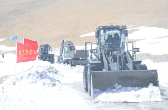 武警官兵操作挖掘機(jī)、裝載機(jī)在國(guó)道219線馬攸木拉達(dá)坂路段進(jìn)行破冰清雪。