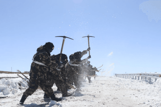 擔(dān)負(fù)這個(gè)路段養(yǎng)護(hù)保通任務(wù)的武警某部交通第三支隊(duì)養(yǎng)護(hù)三大隊(duì)抽組專業(yè)技術(shù)骨干,出動(dòng)破冰機(jī)、拋雪機(jī)、挖掘機(jī)等大型搶險(xiǎn)裝備進(jìn)行清雪除冰。