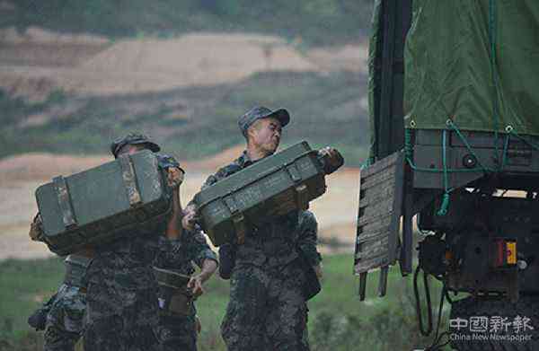 官兵們頂風(fēng)冒雨搬運(yùn)彈藥
