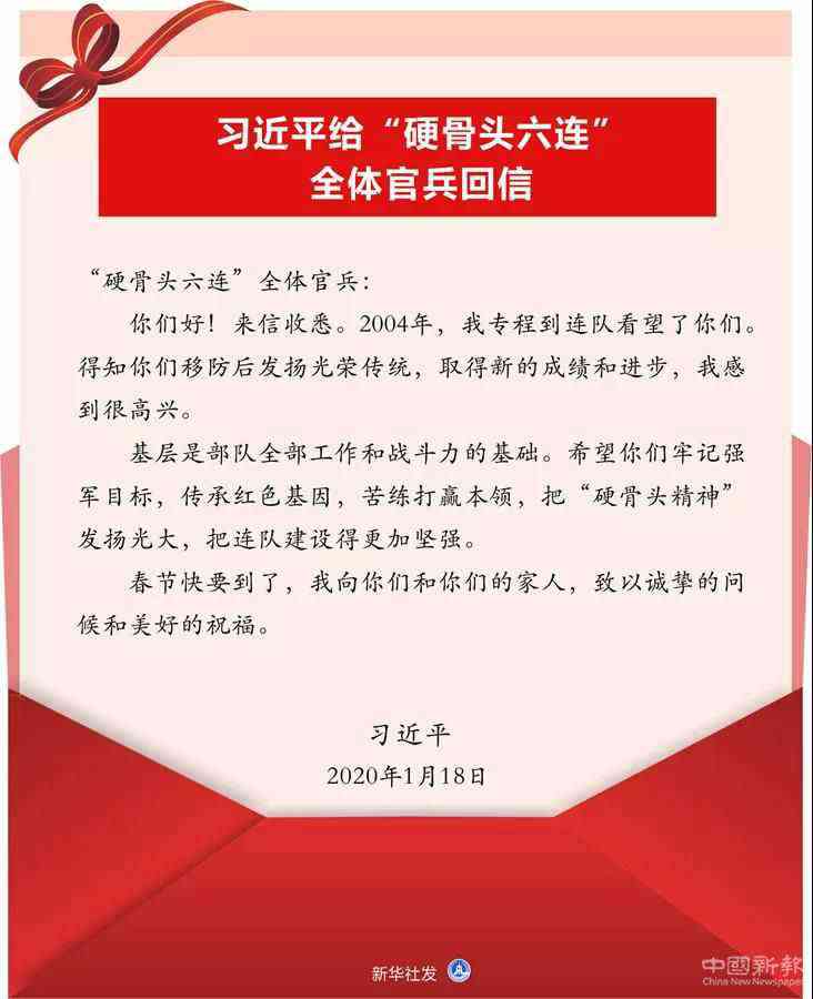 2020年1月,“硬骨頭六連”全體官兵滿懷深情給習(xí)主席寫信,匯報(bào)他們移防以來(lái)工作、學(xué)習(xí)等方面情況,表達(dá)牢記習(xí)主席囑托、發(fā)揚(yáng)光榮傳統(tǒng)、矢志強(qiáng)軍打贏的堅(jiān)定決心。