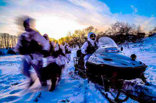 東極哨所官兵組織摩托雪橇和執(zhí)勤分隊進行聯(lián)合戰(zhàn)術(shù)演練(11月4日攝)。新華社發(fā)(李寶成 攝)