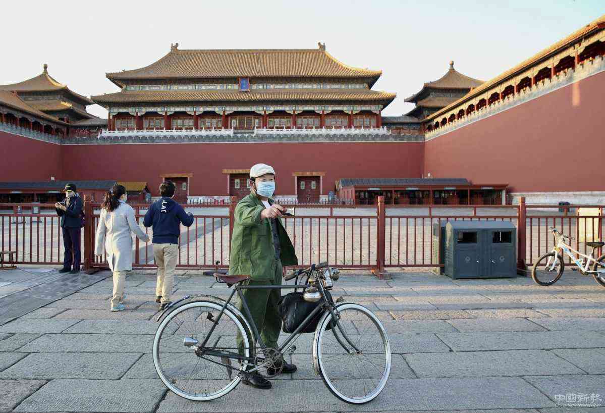 3月28日,市民推著單車在故宮午門留影。(中國日報記者 鄒紅 攝)
