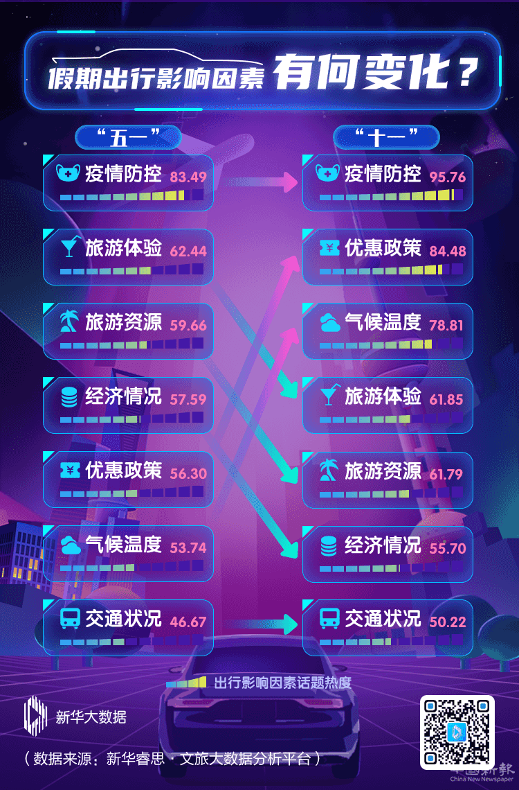 今年黃金周,消費(fèi)者偏好又發(fā)生了哪些變化呢?新華睿思數(shù)據(jù)顯示,疫情防控、旅游體驗(yàn)、優(yōu)惠政策、氣候溫度、交通狀況等是影響居民“十一”出行的重要因素。其中,做好個(gè)人出游安全防護(hù)工作一直都是游客出行最為關(guān)注的要點(diǎn)。各地為刺激旅游市場、促進(jìn)當(dāng)?shù)叵M(fèi)所出臺(tái)的一系列優(yōu)惠政策也使游客的出行更具有傾向性,“優(yōu)惠政策”相關(guān)話題討論熱度上升至84.48,較“五一”期間提升50.13%。此外,“十一”黃金周正處于天氣溫度變化較頻繁時(shí)期,“氣候溫度”也成為游客出行的重點(diǎn)關(guān)切因素。
