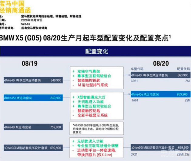 相較2020款車型,據(jù)我們此前拿到的配置信息來看,2021款X5 xDrive30i M運動套裝/X設計套裝新增無鑰匙進入功能、專業(yè)型互聯(lián)駕駛組合調(diào)整,減少運動型手自一體變速箱,帶換擋撥片(僅X-Line);xDrive45e M運動套裝新增X型智能激光大燈、無鑰匙進入功能、尊享型互聯(lián)駕駛組合,減少智能觸控鑰匙、全彩平視顯示系統(tǒng);xDrive40i 尊享型M運動套裝新增雙軸空氣懸架、尊享型互聯(lián)駕駛組合,減少智能觸控鑰匙、M運動型排氣系統(tǒng),該車價格將提升1.4萬。