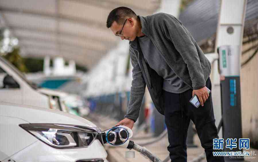 在昆明從事網(wǎng)約車(chē)業(yè)務(wù)的秦師傅在給自己的車(chē)輛充電(12月2日攝)。新華社記者 江文耀 攝