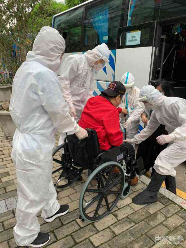 圖:臺胞乘坐包機回到東莞。工作人員協(xié)助行動不便的臺胞上車\受訪者供圖
