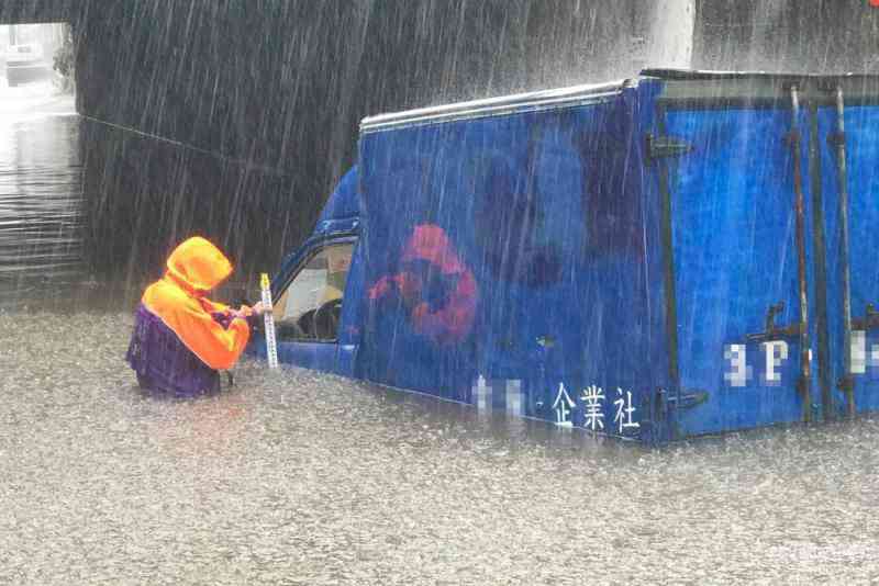 圖:受?臺風(fēng)影響,桃園市下暴雨。一輛小貨車拋錨受困\中央社