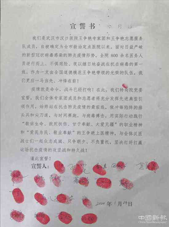 2020年1月24日鼠年除夕,30余名武漢市漢口醫(yī)院王爭(zhēng)艷專家團(tuán)和王爭(zhēng)艷青年志愿者服務(wù)隊(duì)的代表在全國(guó)道德模范王爭(zhēng)艷的帶領(lǐng)下,現(xiàn)場(chǎng)宣誓:將一馬當(dāng)先、沖鋒在前、奮戰(zhàn)在抗擊新型肺炎疫情的第一線.
