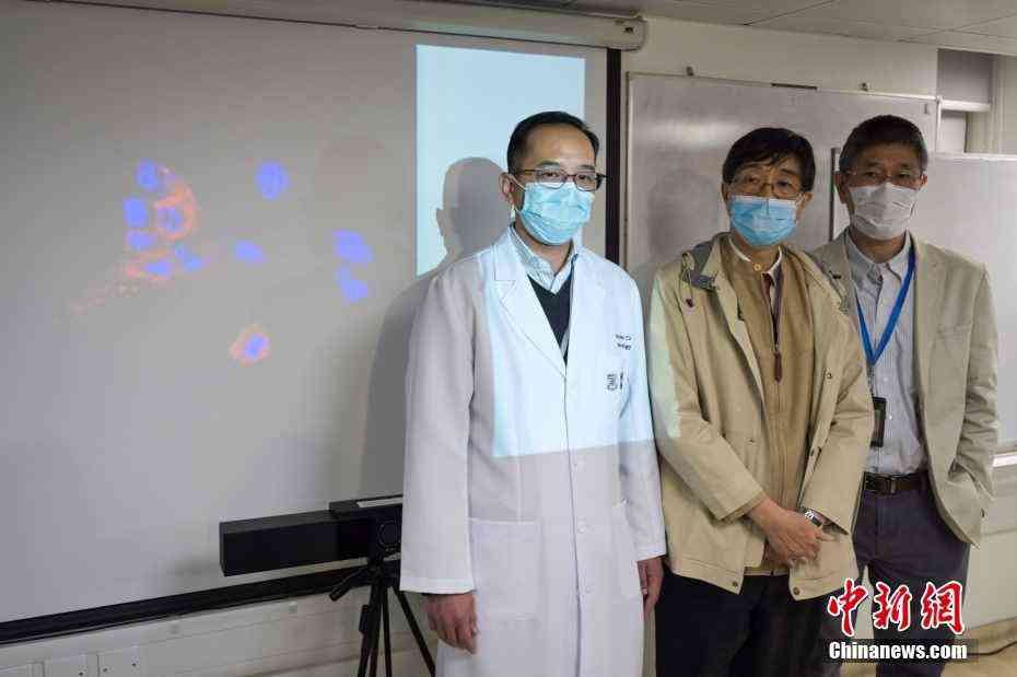 圖為研究團隊成員香港大學(xué)微生物學(xué)系講座教授袁國勇(中)、香港大學(xué)微生物學(xué)系教授陳鴻霖(右)、香港大學(xué)微生物學(xué)系系主任杜啟泓(左)。 中新社記者 陳永諾 攝