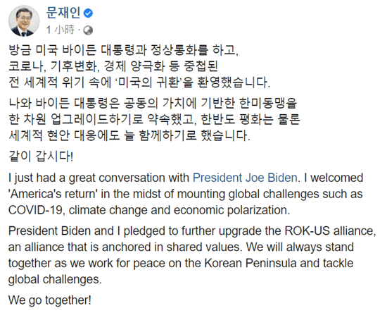 韓美兩國(guó)領(lǐng)導(dǎo)人首次正式通話。(文在寅FB)