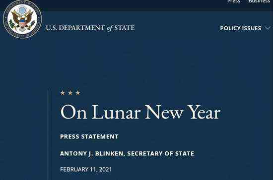 當?shù)貢r間2月11日,美國國務院官網(wǎng)發(fā)表新聞公報,國務卿安東尼·布林肯在這份題為“在農(nóng)歷新年”的公報中向世界各地的朋友拜年。