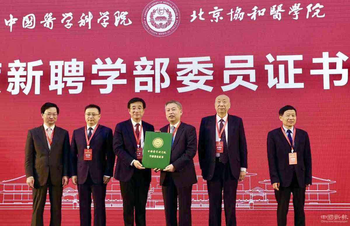 4月17日,中國醫(yī)學(xué)科學(xué)院北京協(xié)和醫(yī)學(xué)院院校長王辰(左三)為2020年度新選聘的學(xué)部委員頒授證書。  中國日報(bào)記者 朱興鑫 攝
