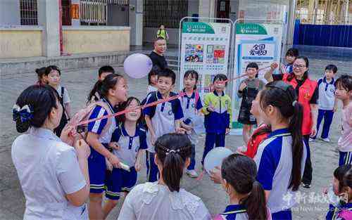 活動結(jié)束了,小記者們還戀戀不舍地與醫(yī)護人員們進行交流。邵東市人民醫(yī)院的黨員志愿者們還來到戶外,和學(xué)生們一起玩起了“頂氣球”的游戲。