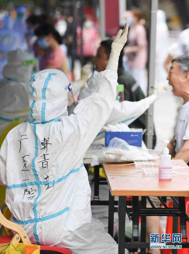 6月12日,在廣州荔灣區(qū)白鶴洞街廣鋼新城,醫(yī)務(wù)人員舉手示意居民前來(lái)進(jìn)行核酸檢測(cè)采樣。新華社記者 鄧華 攝