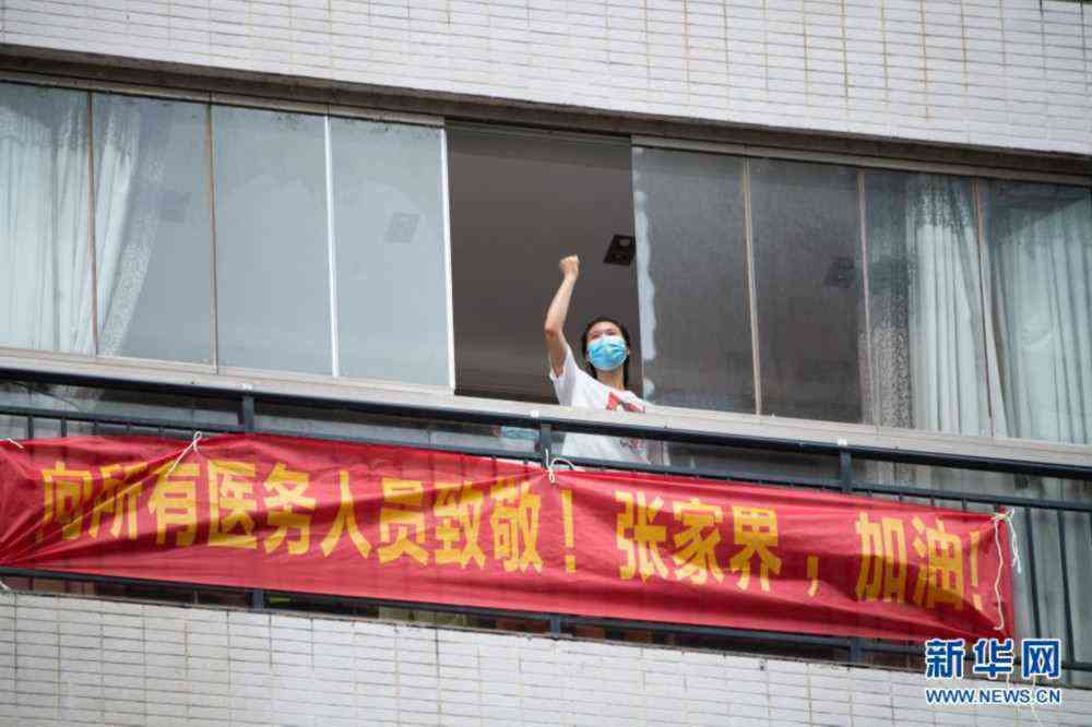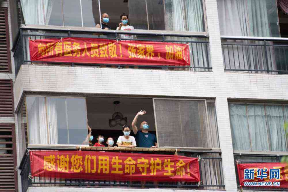 當(dāng)日,在湖南省張家界市月亮灣花園小區(qū),部分居家群眾在陽(yáng)臺(tái)外懸掛感謝醫(yī)務(wù)人員的橫幅,得到了在對(duì)面酒店居住的醫(yī)務(wù)人員回應(yīng),相互加油。