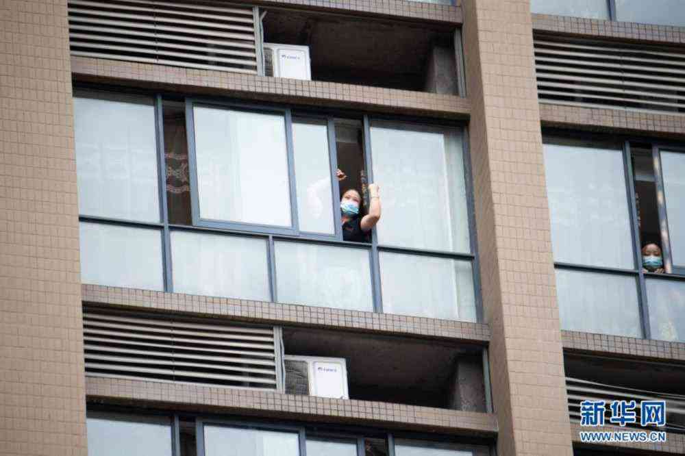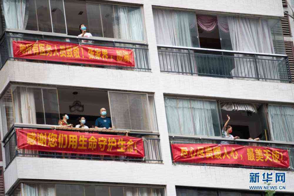 8月10日,在張家界市月亮灣花園小區(qū),居家隔離的群眾向在對(duì)面酒店居住的醫(yī)務(wù)人員致意。