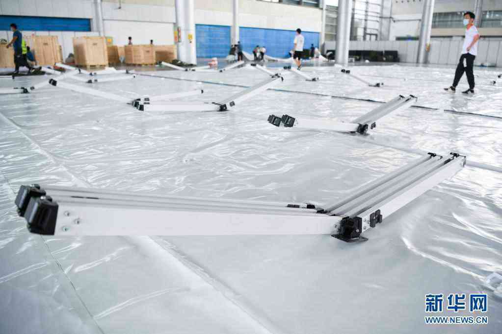 8月10日,工作人員在江蘇揚(yáng)州國際展覽中心搭建“獵鷹號”硬氣膜實(shí)驗(yàn)室。新華社記者 李博 攝